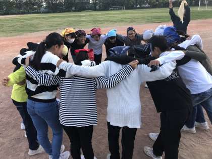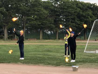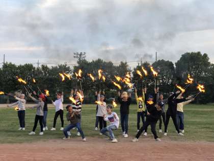 林間学習1日目のキャンプファイヤーの中で披露する,有志による火舞いのリハーサルを行いました。