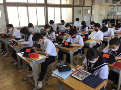 国語の授業で修学旅行の新聞を作っています。班別研修で学んだことが記事の中心です。みんな集中して取り組んでいます。