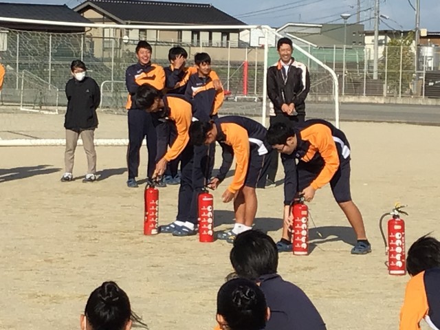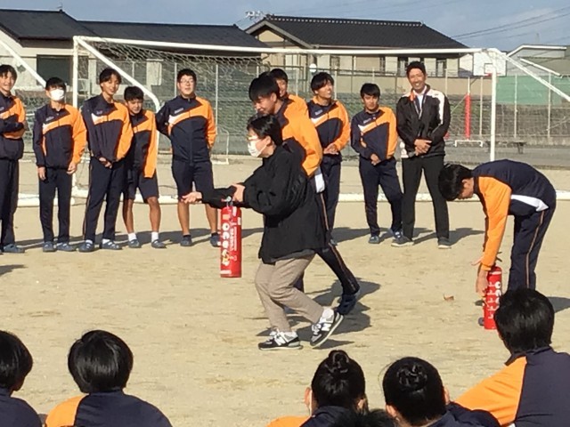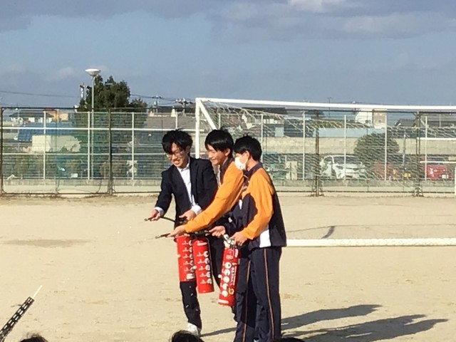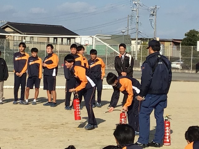 3年生は、教室からの避難訓練の他、代表の生徒と先生が消火器の練習を行い、他の生徒はその様子を見学しました。消防署の職員さんから、消火器の説明や使用法を教えていただき、生徒たちは熱心に耳を傾けていました。