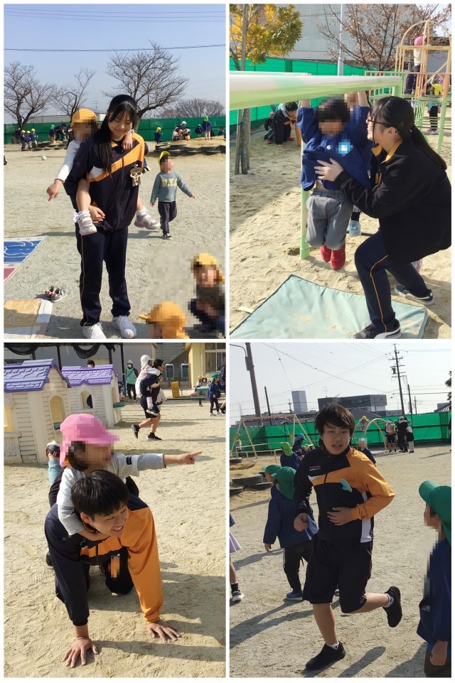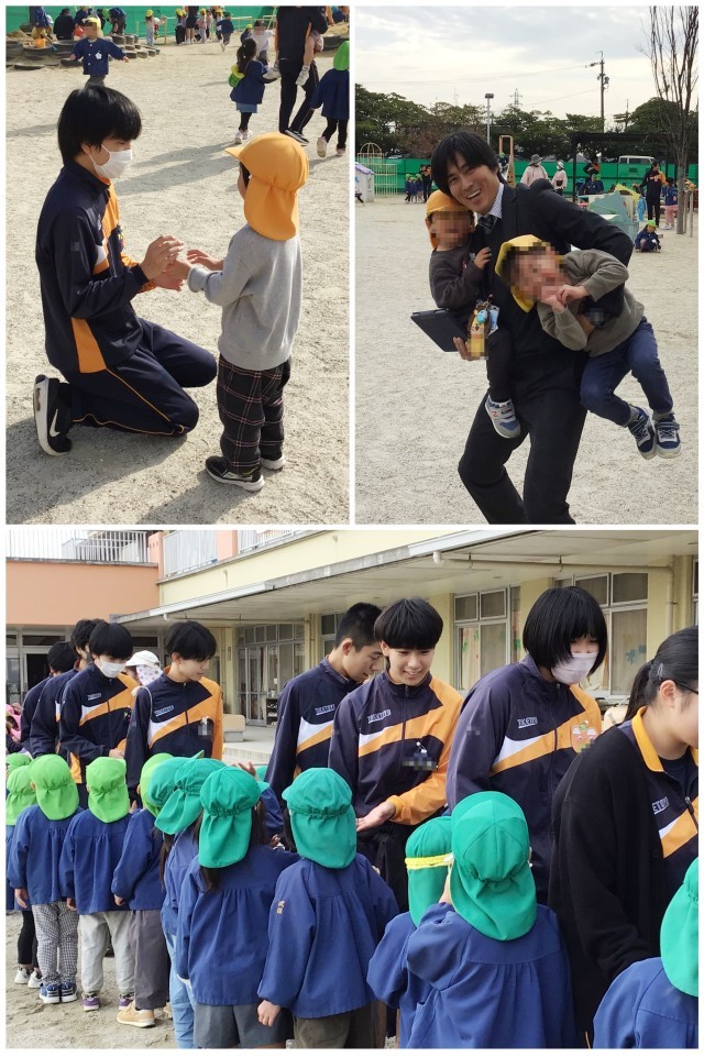 かわいい園児との触れ合いを通して、にこにこ笑顔になる生徒たち
