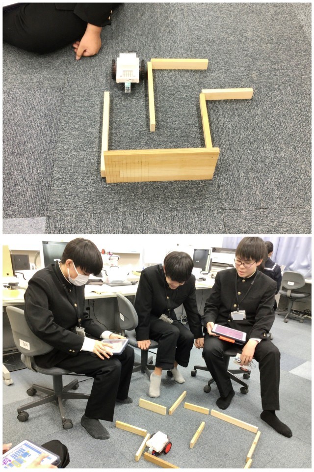 「道を曲がるように」、「車が机から落ちないように」プログラミング