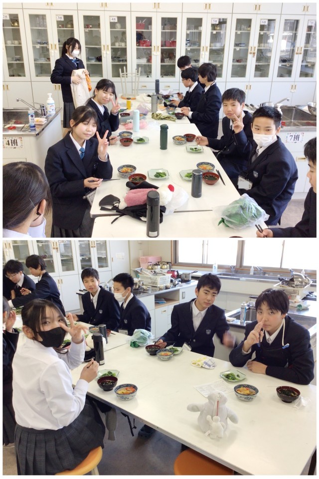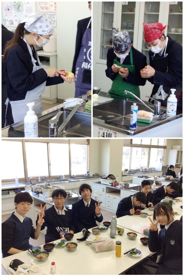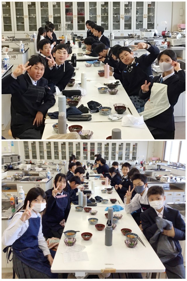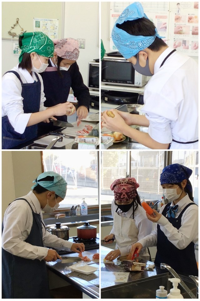 どのグループもチームワークよく「肉じゃが」「青菜のごま和え」「わかめスープ」を仕上げました