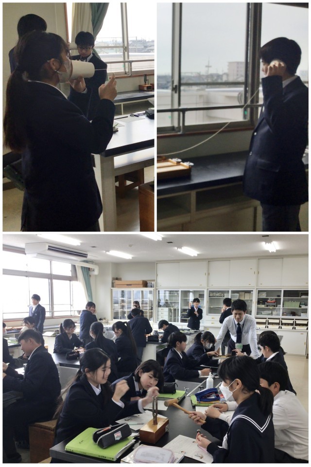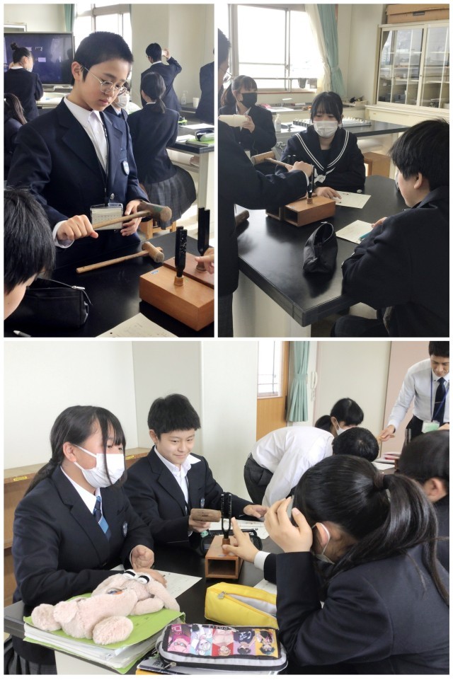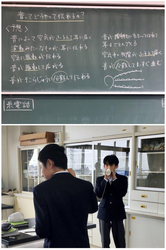 「糸電話」「音叉」を用いて、音の伝わり方を体感中