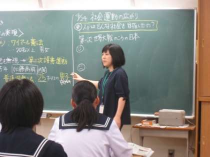 次に,「今の理想的な日本」について,教師が尋ねると,人が亡くならない世の中,犯罪のない世の中,経済が成長している日本‥などが発表されました。「なぜ,経済的に豊かだといいの?」という教師のつっこんだ問いに,生徒は「経済が豊かだと国が安定していて,犯罪が少なくなるから」と発言しました。表現の仕方は違っていても,平和な国であってほしいという願いが強いことがよく分かりました。