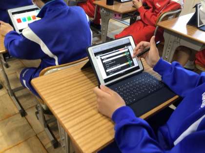 毎週水曜日の6限後にタブレットを使った学習を行っています。各自が決められた課題に取り組みます。