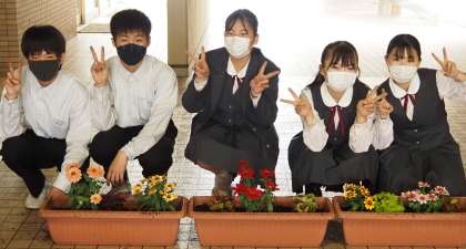 昨年度本校を卒業し,今年度から半田農業高校に通っている生徒が母校訪問に来ました。華やかな鉢植えを作成し,寄付をしてくれました。大切に育てていきます。ありがとうございました。