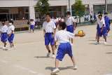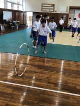 1年生の体育ではフラフープを使ったからだつくり運動が行われていました。前に転がし...